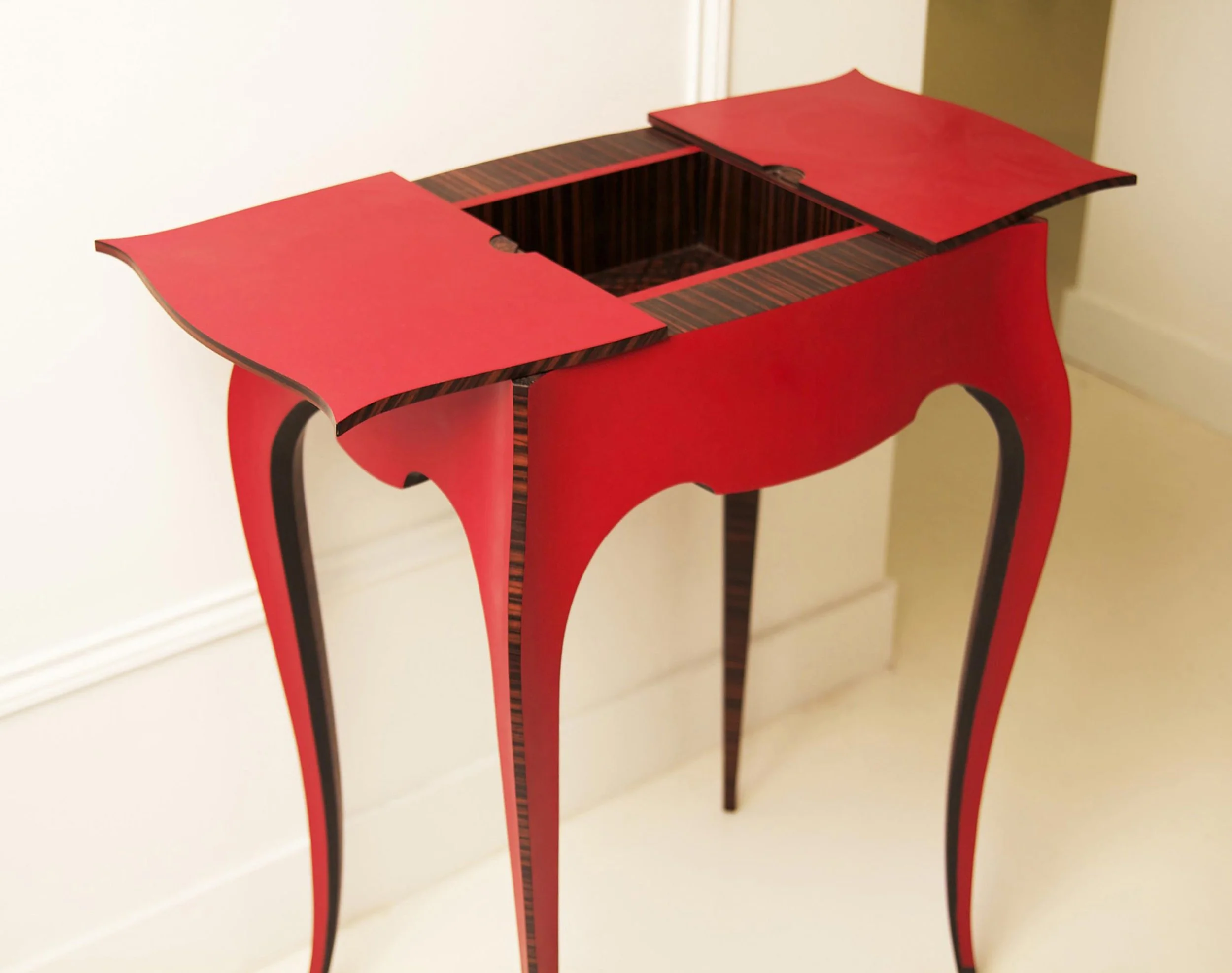 Sur son plateau, avec une discrétion raffinée, Rubis dissimule un vide-poche secret dont le décor révèle une marqueterie géométrique d’ébène.