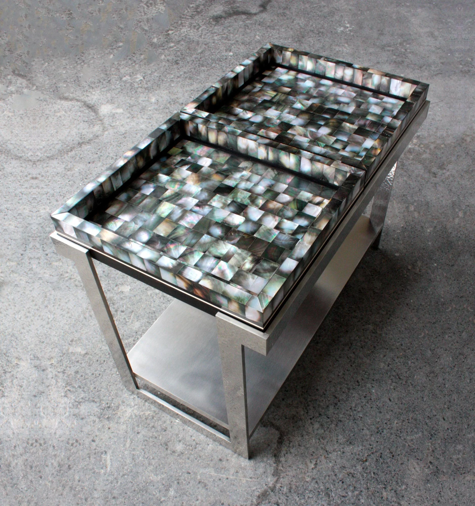 Fabrication de deux plateaux en nacre noire de Tahiti, bois d’ébène noir et bois d’érable sycomore.